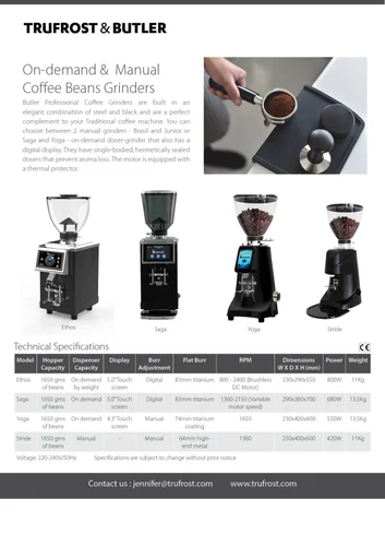 Butler Professional Coffee Grinders are built in an elegant combination of steel and black and are a perfect complement to your Traditional coffee machine. You can choose between manual grinder – Stride or Saga and Yoga – on-demand doser-grinder that also has a digital display. They have single-bodied, hermetically sealed dosers that prevent aroma loss. The motor is equipped with a thermal protector.