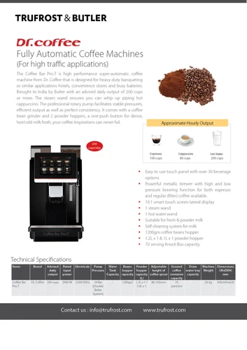 The Coffee Bar Pro-T is high performance super-automatic coffee machine from Dr. Coffee that is designed for heavy duty banqueting or similar applications hotels, convenience stores and busy bakeries. Brought to India by Butler with an advised daily output of 200 cups or more. The steam wand ensures you can whip up piping hot cappuccino. The professional rotary pump facilitates stable pressures, efficient output as well as perfect consistency. It comes with a coffee bean grinder and 2 powder hoppers, a one-push button for dense, hot/cold milk froth, your coffee inspirations can never fail.