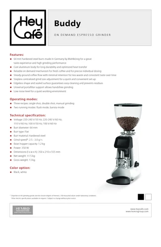 The Heycafe BUDDY is a coffee grinder that’s highly regarded in the world of coffee enthusiasts and professionals. It has a modern design that combines aesthetics with functionality. The BUDDY is known for its excellent grind quality, giving baristas and coffee lovers precise control over their coffee grounds. It features 64mm flat burrs made of durable stainless steel, ensuring consistency and uniformity in grind size, which is essential for a balanced extraction.