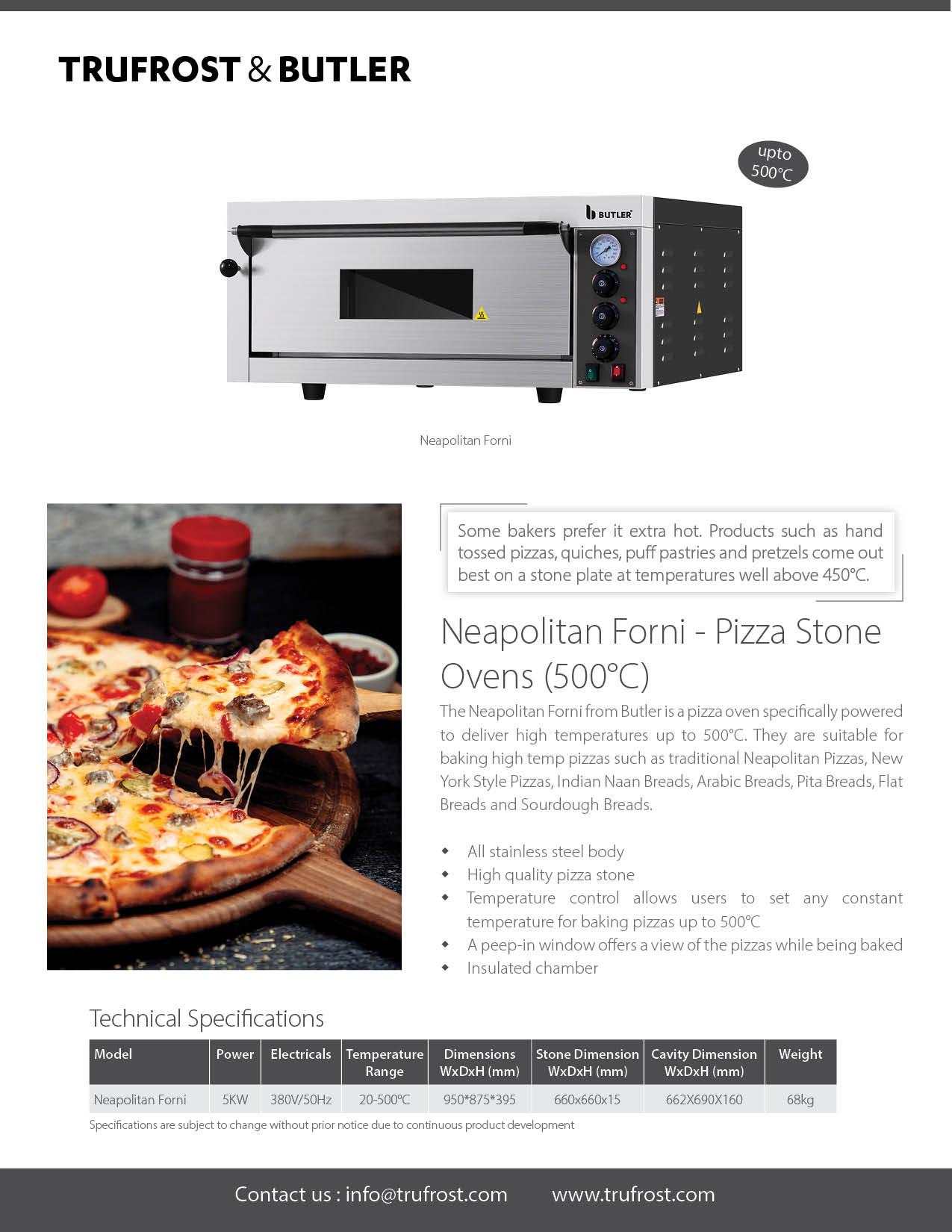 The Neapolitan Forni from Butler is a pizza oven specifically powered to deliver high temperatures up to 500°C. They are suitable for baking high temp pizzas such as traditional Neapolitan Pizzas, New York Style Pizzas, Indian Naan Breads, Arabic Breads, Pita Breads, Flat Breads and Sourdough Breads.